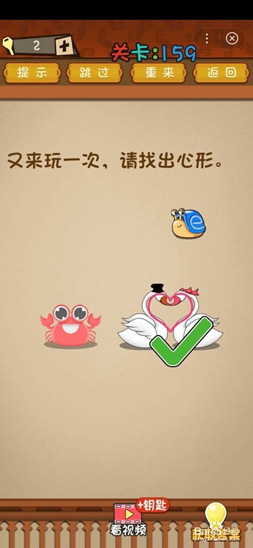 第159关将一只鹅移动到另一只鹅的位置形成心形就过关了。