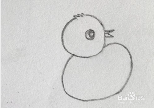 首先,先画一个近似圆,上面有一小撮毛,这是小鸡的头部。