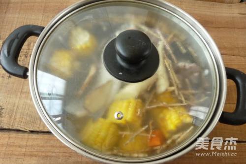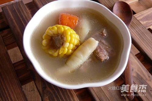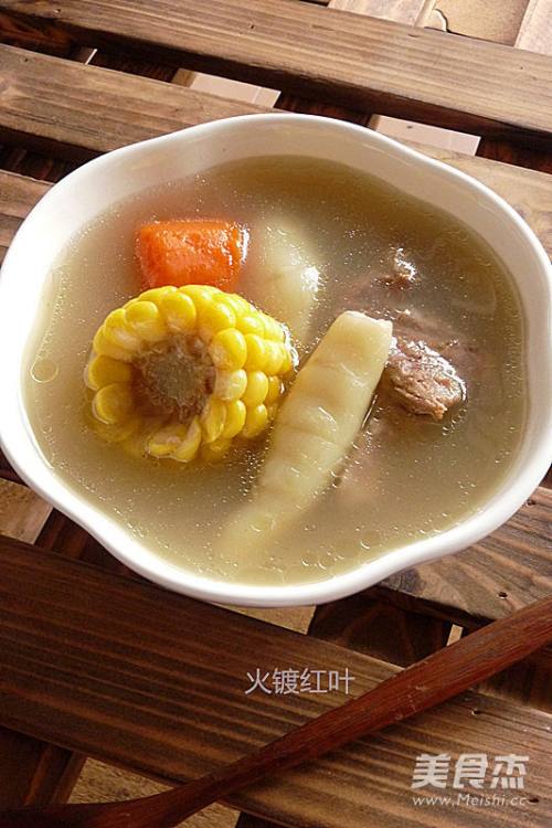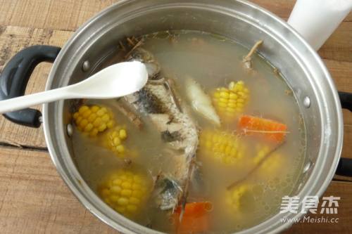 备材料:肉骨出血水,鲫鱼用油、姜片煎过,红萝卜、玉米切大块