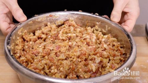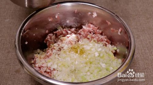 将姜末、葱末倒入肉馅中同时将适量的盐、花椒面、料酒、鸡精倒入其中,还可以根据个人喜好倒入一些香油。