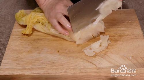 准备一颗腌制好的酸菜并用刀将其根部去除