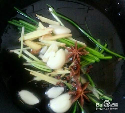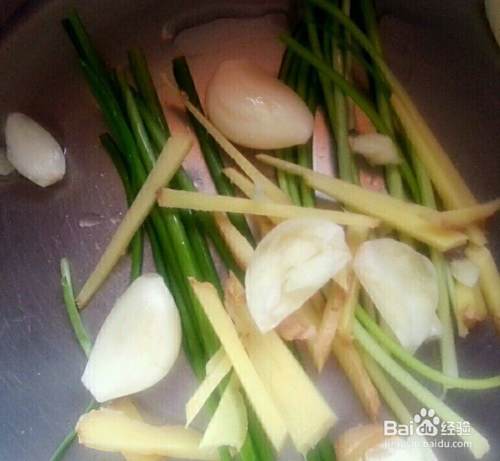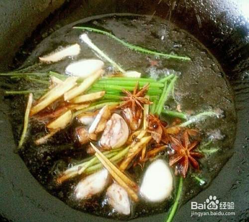炒锅加热,放入少许的油,油热后放入姜片,蒜片和香葱等调料