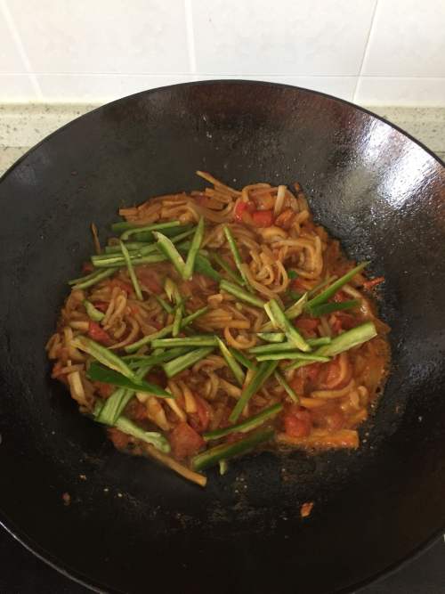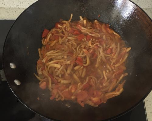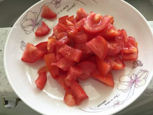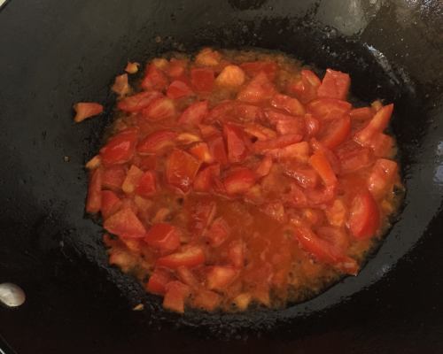 4锅里倒入适量的油,多一些没关系,茄子吃油。油热后放入西红柿,炒出汤汁。