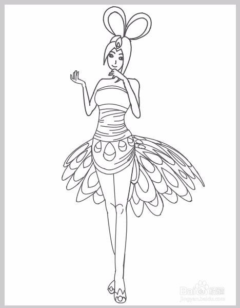 之后把叶罗丽精灵梦下面的身体画出来,小裙子要画出孔雀的斑点,双腿要画得细长。
