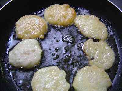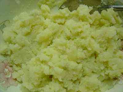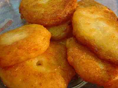 将加过面粉(定形)后成的土豆饼雏形放进平底锅里炸,记得用小火来做,否则会影响土豆饼的色泽。