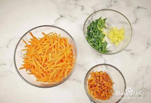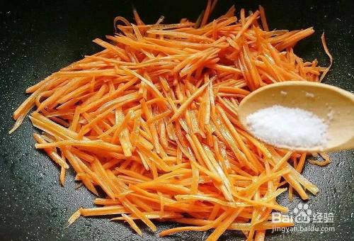 2,胡萝卜丝尽量用擦丝器擦粗一些,胡萝卜丝太细炒出来过软,吃着不脆,也可以用刀把胡萝卜丝切成条来做