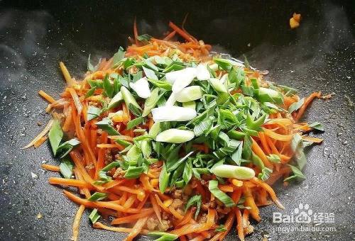 胡萝卜清洗干净外皮的泥土,去掉根蒂,用擦丝器擦成粗一点的长丝,酸咸菜切成碎丁,蒜苗洗净切碎末,生姜切末