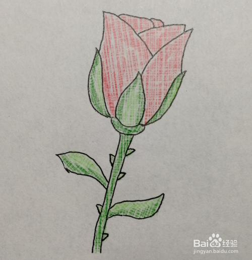 下面给大家分享下如何画一支带刺的玫瑰,然后再使用彩色铅笔填充后的红玫瑰哦