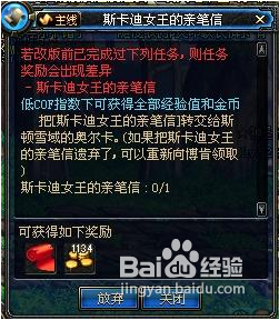 完成斯卡迪女王的亲笔信任务可以获得1134的金币奖励和任务品红色羊皮纸,如下图所示: