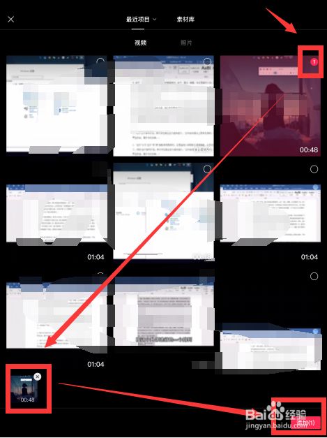 选择我们所需要的素材进行导入。在我们的相册素材中找到需要编辑的视频,将其进行勾选,点击【添加】即可。