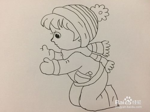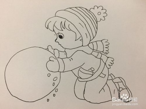 最后在双手下,画出一个大大的雪球,在雪球周围画几个小圆圈。这样滚雪球的小女孩就画好了。