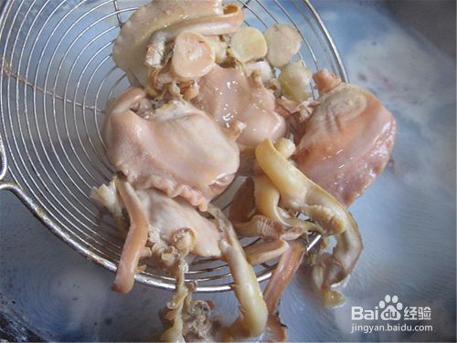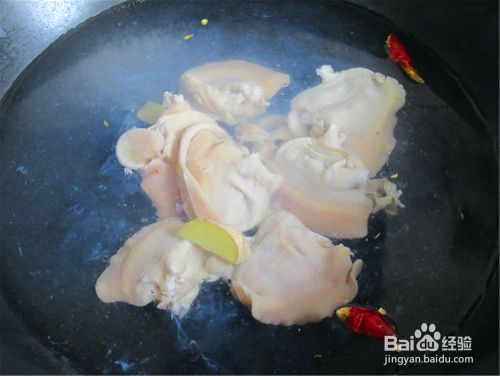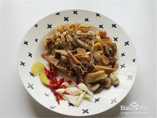 锅中加水,放入两片姜、两个红辣椒和干辣椒,放入蛤蜊中煮沸