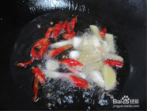 把油放在火锅里加热到七分钟。把红辣椒、姜、大蒜和洋葱炒熟