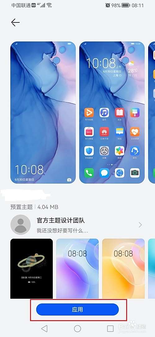 第五步点击应用,鸿蒙系统就恢复默认主题了