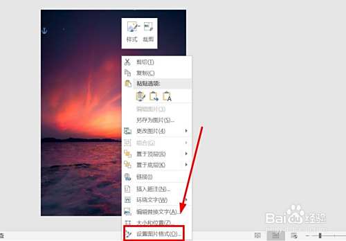 选中背景图片。点击右键,选择“设置图片格式”。
