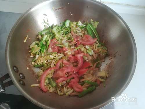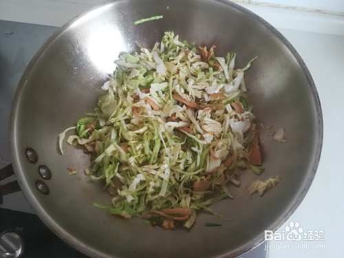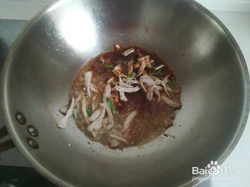 炒锅里倒入花生油,等油六成熟时,放入肉丝炒至变色发白,再放入葱、姜炒出香味,再加入盐,胡椒粉和味极鲜酱油调味。