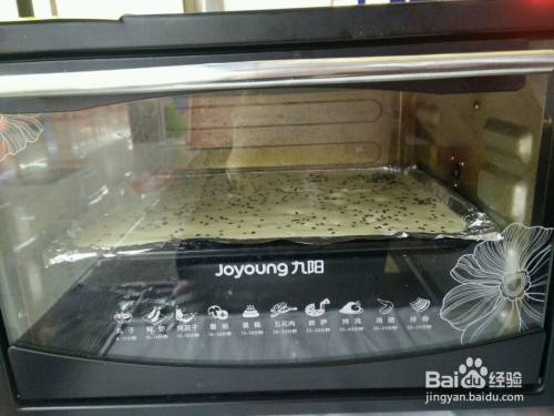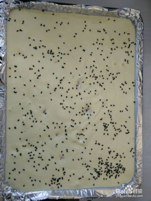 把蛋糕糊倒入烤盘中,刮平整,撒上黑芝麻