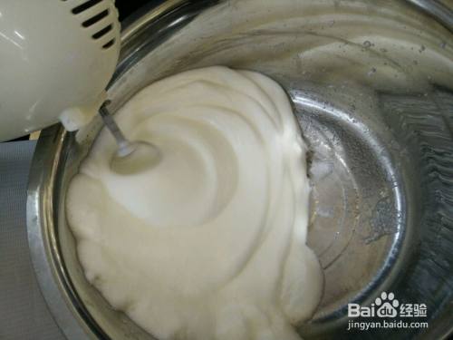 搅打至出现明显纹路时再加入剩下的细砂糖,继续搅打至提起打蛋器蛋白不易滑落