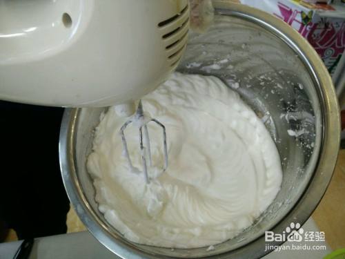 继续搅打蛋白体积彭大,稍有纹路时再加入15克细砂糖