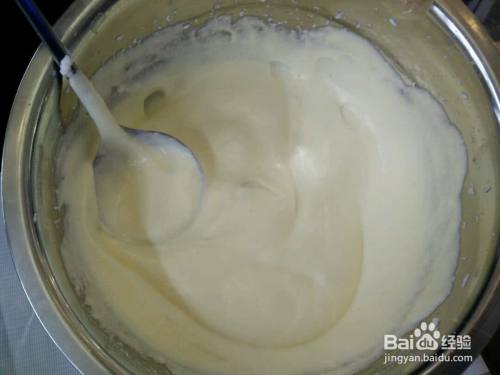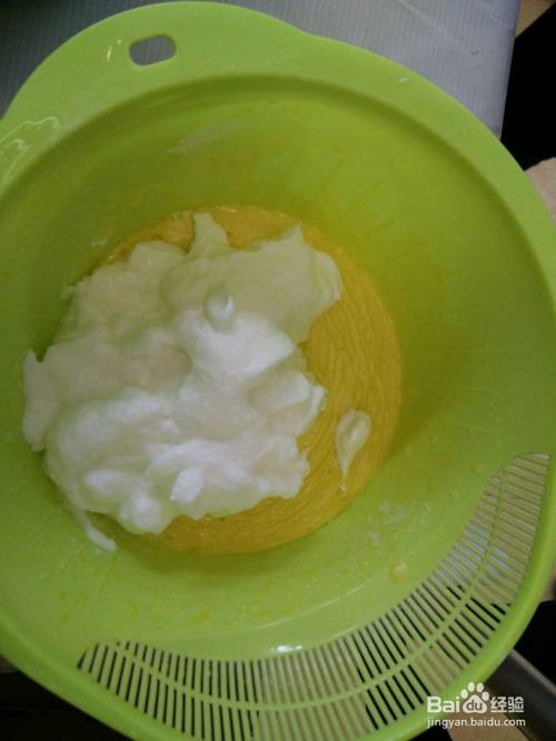 取三分之一蛋白加入蛋黄糊中,翻拌均匀,看不到蛋白为止