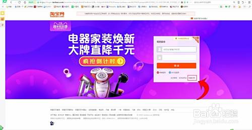 首先打开淘宝网,点击如图箭头的免费注册。