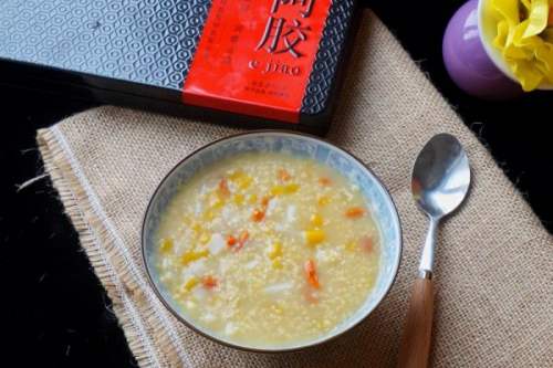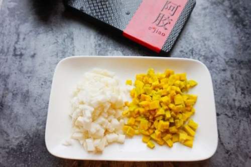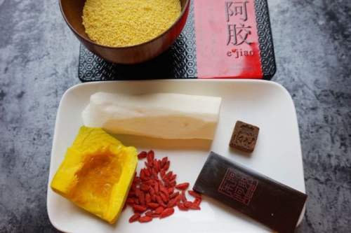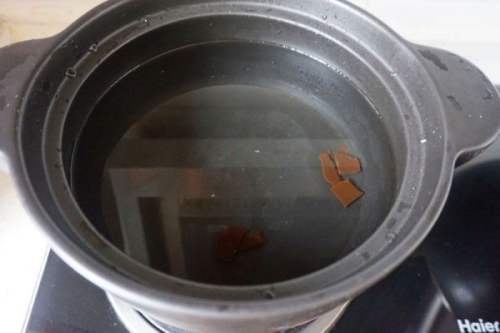 3阿胶用刀背敲碎入锅中烧开水先熬煮至阿胶融化。