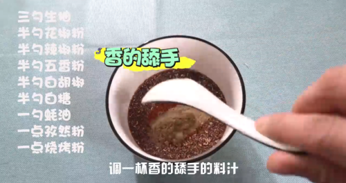 用三勺生抽、半勺花椒粉、辣椒粉、五香粉、白胡椒、白糖。
