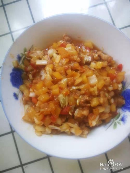将准备好的蔬菜,肉切成小丁,锅中倒入少许油,翻炒,加入少量生抽,盐,炒熟出锅,出锅前放点耗油提味。