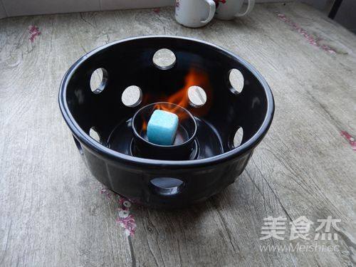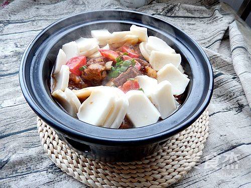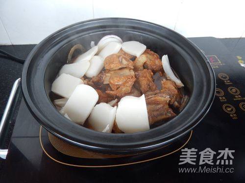 10把煮过排骨连汤装入砂锅胆中。摆上年糕,加盖。
