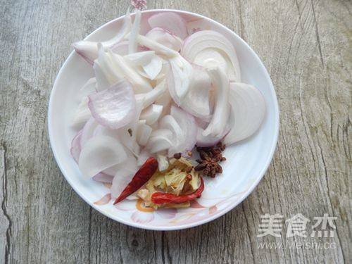 配料:洋葱适量,姜,适量,红干椒2只 八角1只,花椒适量,红烧酱油适量,食用油适量,精盐适量。