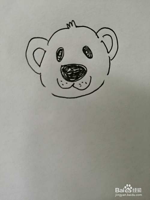 第二步,然后继续画出可爱的小熊的两只黑色的大眼睛和小鼻子,注意小鼻子轮廓的画法。
