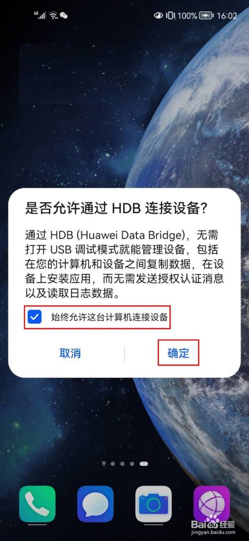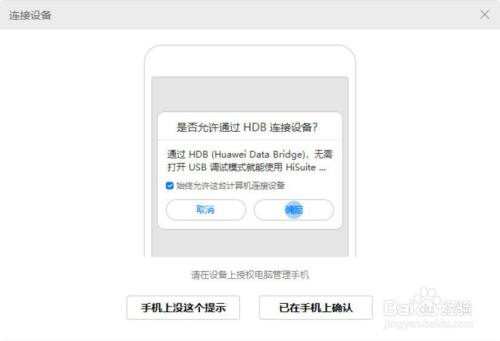 用USB线将手机连接到电脑,在手机端选择USB连接方式为(传输文件),电脑单面手机助手会弹出“是否允许HDB连接设备”对话框。在手机端勾选(始终允许这台计算机连接设备),并点击确定