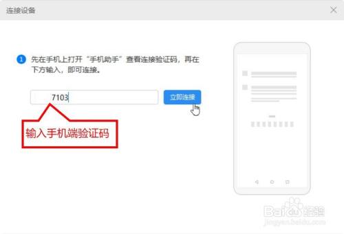 在手机端“手机助手”查看“电脑连接验证码”,然后在电脑输入,单击“立即连接”