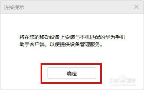 电脑端手机助手会弹出“将在您的设备上安装与本机匹配的华为手机助手客户端,以便提供设备管理服务””对话框,单击确定