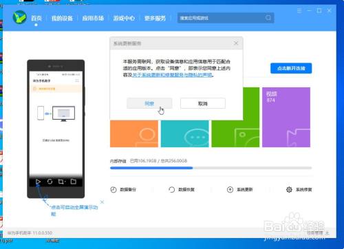 先在电脑端“手机助手”点击“系统更新”,然后再点击同意“系统更新服务”
