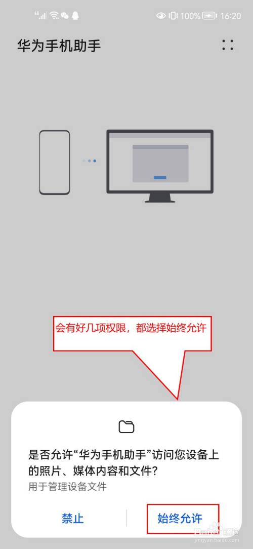 电脑端手机助手会在手机上安装相应的手机端“手机助手”,对弹出的权限都选择“始终允许