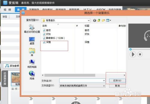 此时出现一个操作界面,然后在出现的界面中,点击一个音乐,然后点击“打开”按钮。