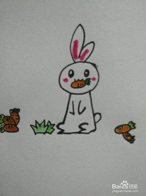 最后我们要在小兔子的周围画上一些小草并涂成绿色,画上一些胡萝卜并涂成橙色,将胡萝卜的叶子涂成绿色,一只萌萌哒的可爱的小兔子就画好了。