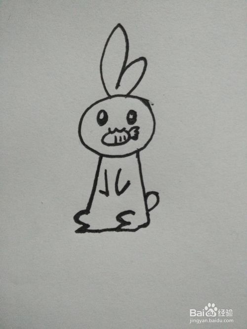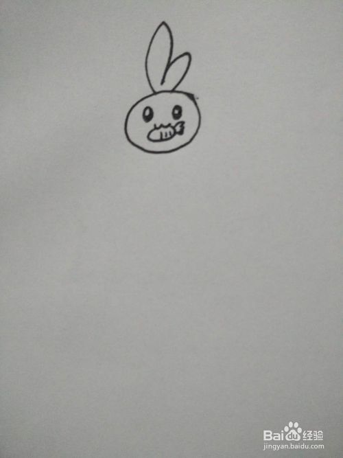 首先我们用黑色中性笔画出小兔子的头部,脸画成一个椭圆形,在脸的上部画出两只眼睛,眼睛下方画上一个小小的胡萝卜,然后在脸的上方画上两只剪刀形状的长长的耳朵。