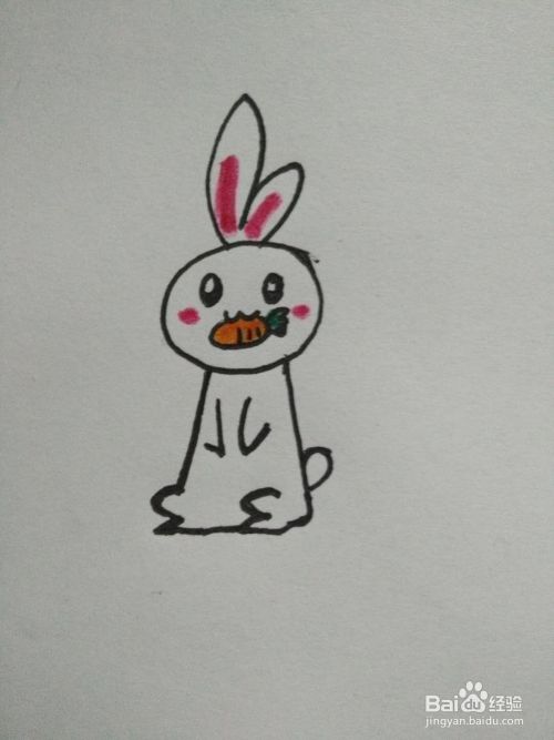 然后我们用粉红色的水彩笔在小兔子脸的两边点上两个红点,在耳朵的中间部位画上两条红线,一只粉嫩嫩的小兔子就呈现出来了,我们用橙色水彩笔将胡萝卜涂成橙色,用浅绿色水彩笔将胡萝卜的叶子涂成绿色。