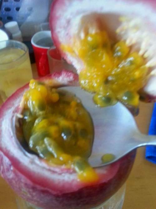 4将百香果切开里面果肉朴鼻而来,很香哦!