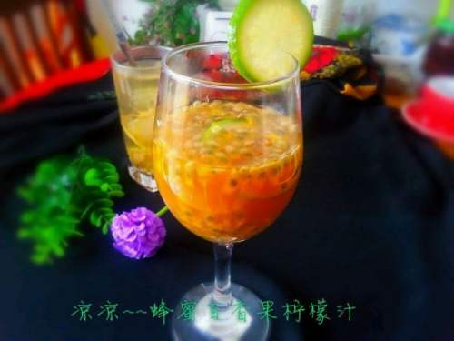 5将百香果肉用盛出杯子里,调入适量蜂蜜和凉开水拌均匀,同时切2块青柠檬调进去。