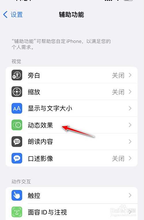 在辅助功能中找到动态效果,点击进入。