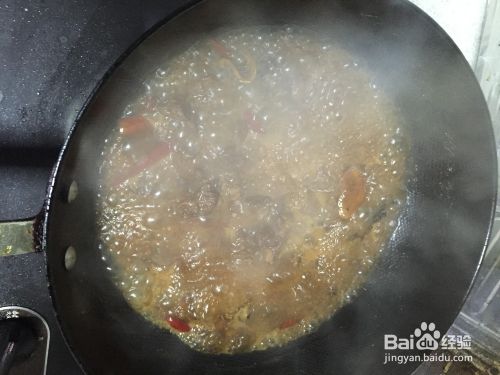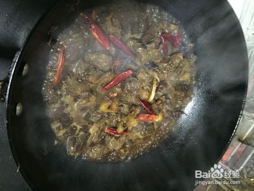 放入准备好的红干辣椒,再翻炒2~3分钟,使牛肉出辣味