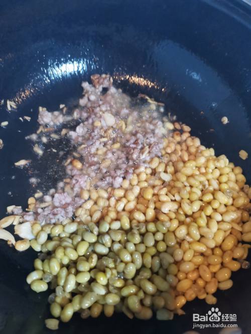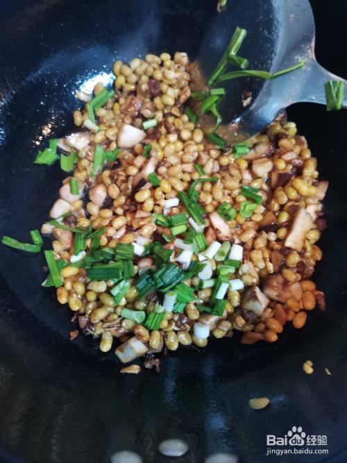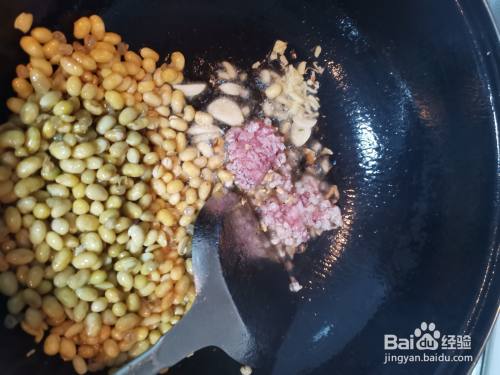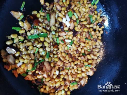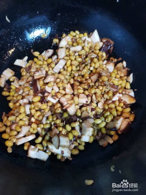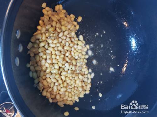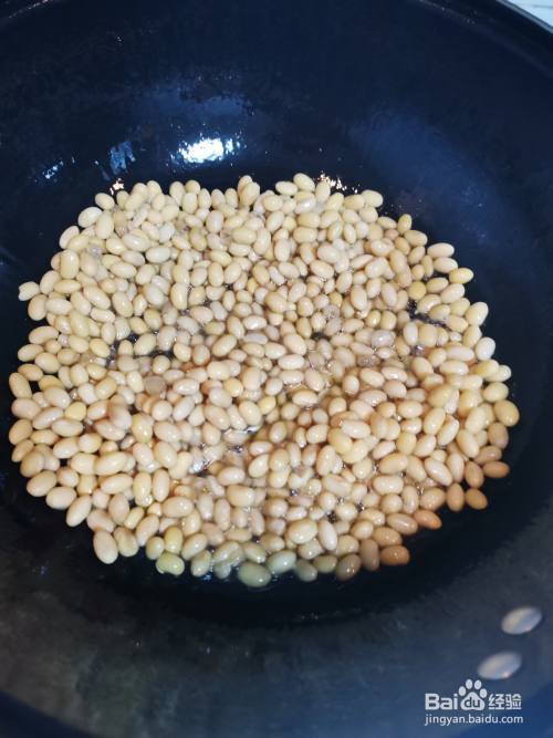 锅里放油烧至八成热,将滤好水的黄豆倒入锅中炒熟放置锅边。