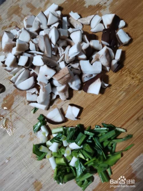 把香菇洗净切成丁,蒜苗去除残叶洗净切小段。