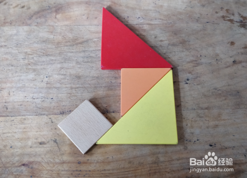 摆上红色三角形,下面摆上橙色三角形,右端一齐,如图。