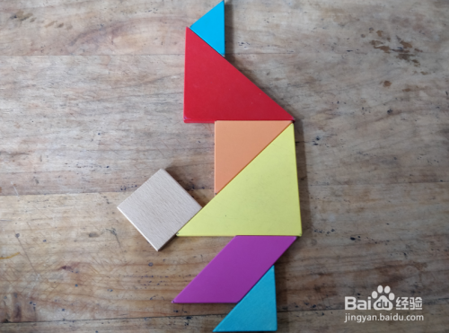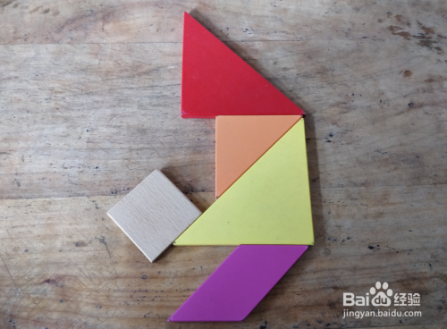 摆上正方形,放在黄色三角形左侧挨着,如图。