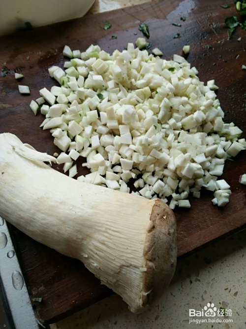 鸡腿菇切末,换其他菇也可以,主要是增加鲜味。老姜要多点,去腥,切末。