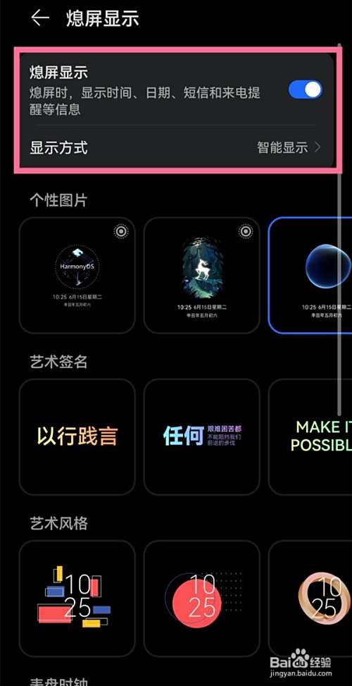 第三步,打开【熄屏显示】开关,还可以自定义选择显示样式和显示方式。